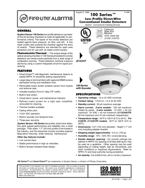 Datasheet for the Fire-Lite 100 Series Smoke Detectors, published in 1998. Document No: DF-51726, Rev: F-495. 13 models including 100 Series, 2100D, 2100TD and 10 additional variants. Engineering specifications, wiring diagrams, and mounting dimensions.