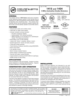 Datasheet for the Fire-Lite 1412 and 1424, published in 1998. Document No: DF-50493. 6 models including 1412, 1424, A77-716B and 3 additional variants. Product features, environmental operating limits, and compatibility data.