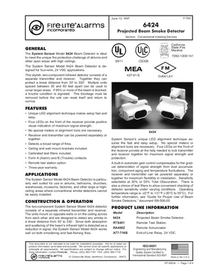 Datasheet for the Fire-Lite 6424, published in 1997. Document No: DF-50934. 4 models including 6424, RTS451, RA400Z and 1 additional variants. Product features, environmental operating limits, and compatibility data.