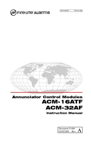Installation, Operations, and Programming Manual for the Fire-Lite ACM-16ATF and ACM-32AF, published in 2001. Document No: 51480, Rev: A. 25 models including ACM-16ATF, ACM-32AF, ACM-16ATCS4F and 22 additional variants. Hardware installation, alarm/fault management, and advanced system configuration.