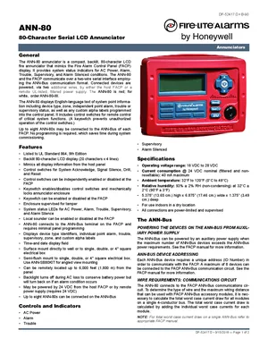 Datasheet for the Fire-Lite ANN-80, published in 2018. Document No: DF-52417, Rev: D. 5 models including ANN-80, ANN-80-W, ANN-SB80KIT and 2 additional variants. Detailed technical specifications, electrical ratings, and agency listings.