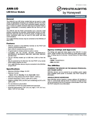 Datasheet for the Fire-Lite ANN-I/O, published in 2018. Document No: DF-52430, Rev: C. 10 models including ANN-I/O, ES-50X, ES-200X and 7 additional variants. Product features, environmental operating limits, and compatibility data.