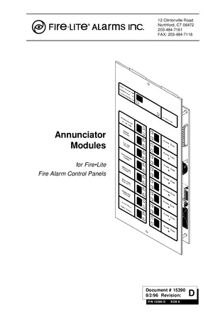 Installation and Operations Manual for the Fire-Lite Annunciator Modules, published in 1996. Document No: 15390, Rev: D. 10 models including AFM-16ATX, AEM-16ATF, ABM-16ATF and 7 additional variants. Complete setup guide and operational workflows.