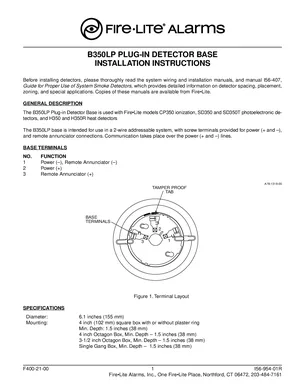 Installation Manual for the Fire-Lite B350LP, published in 2000. Document No: I56-954-01R. 7 models including B350LP, CP350, SD350 and 4 additional variants. Mounting instructions, wiring diagrams, and system power-up procedures.