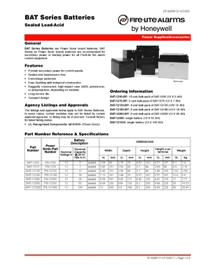Datasheet for the Fire-Lite BAT Series Batteries, published in 2011. Document No: DF-52397, Rev: C1. 7 models including BAT-1250, BAT-1270, BAT-12120 and 4 additional variants. Detailed technical specifications, electrical ratings, and agency listings.