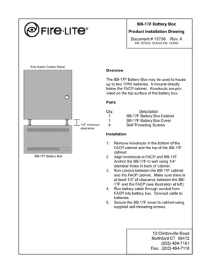 Installation Manual for the Fire-Lite BB-17F, published in 1993. Document No: 15736, Rev: A. Model BB-17F. Physical installation guide, backbox dimensions, and cabling specifications.