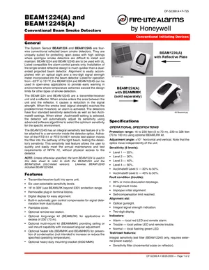 Datasheet for the Fire-Lite BEAM1224 and BEAM1224S, published in 2009. Document No: DF-52399, Rev: A. 15 models including BEAM1224, BEAM1224A, BEAM1224S and 12 additional variants. Detailed technical specifications, electrical ratings, and agency listings.