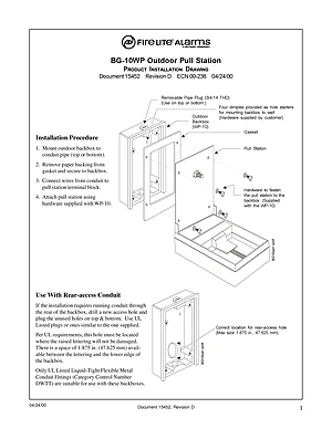 Installation Manual for the Fire-Lite BG-10WP, published in 2000. Document No: 15452, Rev: D. Model BG-10WP. Hardware installation, terminal connections, and environmental requirements.