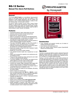 Datasheet for the Fire-Lite BG-12 Series, published in 2008. Document No: DF-52004, Rev: A1. 17 models including BG-12S, BG-12SL, BG-12 and 14 additional variants. Product features, environmental operating limits, and compatibility data.