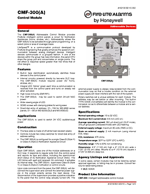 Datasheet for the Fire-Lite CMF-300(A), published in 2010. Document No: DF-52130, Rev: B2. Models CMF-300 and CMF-300A. Detailed technical specifications, electrical ratings, and agency listings.