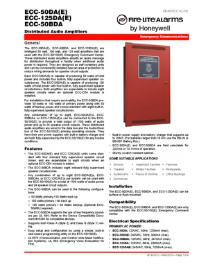 Datasheet for the Fire-Lite ECC-50DA, ECC-125DA and ECC-50BDA, published in 2015. Document No: DF-60763, Rev: C. 36 models including ECC-50DA, ECC-50DAE, ECC-125DA and 33 additional variants. Detailed technical specifications, electrical ratings, and agency listings.