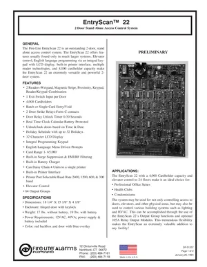 Datasheet for the Fire-Lite EntryScan 22 System, published in 1994. Document No: DF-51357. 10 models including EntryScan 22, PTR22, 102A and 7 additional variants. Product features, environmental operating limits, and compatibility data.