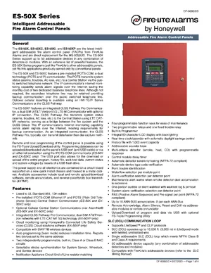 Datasheet for the Fire-Lite ES-50X Series, published in 2023. Document No: DF-60953, Rev: D. 136 models including ES-50X, ES-50XC, ES-50XI and 133 additional variants. Product features, environmental operating limits, and compatibility data.