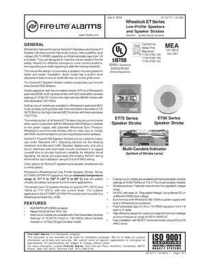 Datasheet for the Fire-Lite ET Series Speakers and Speaker Strobes, published in 2004. Document No: DF-51771. 13 models including ET70-24MCW-FR, ET70-24MCW-FW, ET70-241575W-FR and 10 additional variants. Product features, environmental operating limits, and compatibility data.