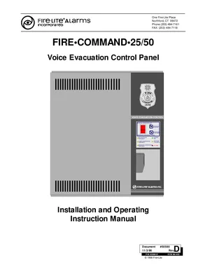 Installation, Operations, and Programming Manual for the Fire-Lite Fire Command 25/50, published in 1998. Document No: 50580, Rev: D. 14 models including 25/50, FC-AAM25, FC-XRM70 and 11 additional variants. Hardware installation, alarm/fault management, and advanced system configuration.
