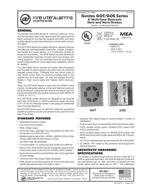 Datasheet for the Fire-Lite GOT/GOS Series Horns, published in 1998. Document No: DF-51870. 20 models including GOT, GOS, GOT-24R and 17 additional variants. Detailed technical specifications, electrical ratings, and agency listings.