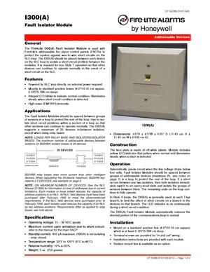 Datasheet for the Fire-Lite I300 Isolator Module, published in 2012. Document No: DF-52389, Rev: B. 5 models including I300, I300A, B224BIA and 2 additional variants. Engineering specifications, wiring diagrams, and mounting dimensions.
