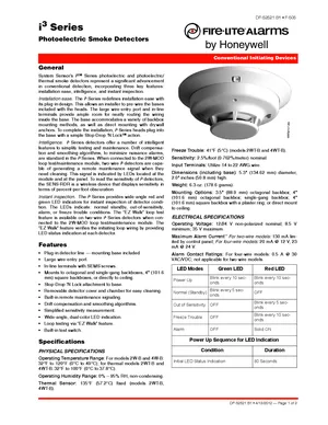 Datasheet for the Fire-Lite i3 Series Photoelectric Detectors, published in 2012. Document No: DF-52521, Rev: B1. 8 models including 2W-B, C2W-BA, 2WT-B and 5 additional variants. Detailed technical specifications, electrical ratings, and agency listings.