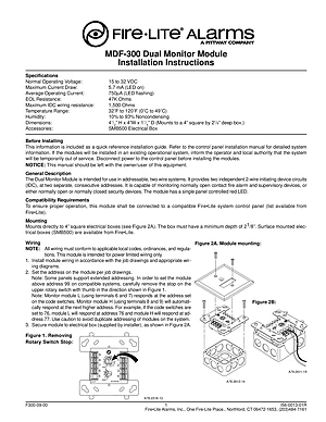 Installation Manual for the Fire-Lite MDF-300 Dual Monitor Module, published in 2000. Document No: I56-0013-01R, Rev: R. Model MDF-300. Physical installation guide, backbox dimensions, and cabling specifications.