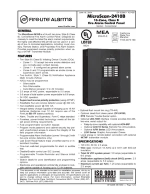 Datasheet for the Fire-Lite MicroScan-2410B, published in 2004. Document No: DF-52095, Rev: A2-425. 17 models including MicroScan-2410B, MS-2410B, XRM-24 and 14 additional variants. Detailed technical specifications, electrical ratings, and agency listings.