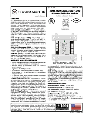 Datasheet for the Fire-Lite MMF-300 Series and MDF-300 Monitor Modules, published in 2001. Document No: DF-52121, Rev: E-325. 4 models including MMF-300, MMF-301, MMF-302 and 1 additional variants. Detailed technical specifications, electrical ratings, and agency listings.