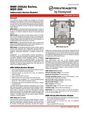 Datasheet for the Fire-Lite MMF-300(A) Series and MDF-300 Monitor Modules, published in 2015. Document No: DF-52121, Rev: E. 4 models including MMF-300, MMF-301, MMF-302 and 1 additional variants. Detailed technical specifications, electrical ratings, and agency listings.