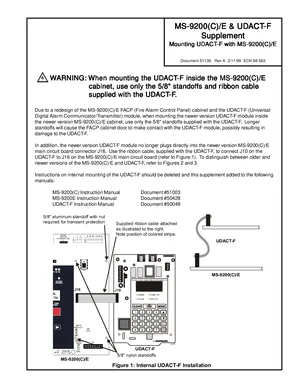 Installation Manual for the Fire-Lite Mounting UDACT-F with MS-9200, published in 1999. Document No: 51139, Rev: A. 4 models including MS-9200, MS-9200C, MS-9200E and 1 additional variants. Physical installation guide, backbox dimensions, and cabling specifications.
