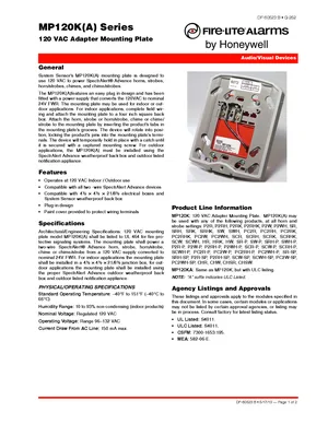 Datasheet for the Fire-Lite MP120K Series Mounting Plate, published in 2013. Document No: DF-60523, Rev: B. 57 models including MP120K, MP120KA, P2R and 54 additional variants. Product features, environmental operating limits, and compatibility data.