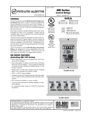 Datasheet for the Fire-Lite MR Series Control Relays, published in 2004. Document No: DF-51131, Rev: I-300. 13 models including MR-101/T, MR-101/CR, MR-104/T and 10 additional variants. Detailed technical specifications, electrical ratings, and agency listings.