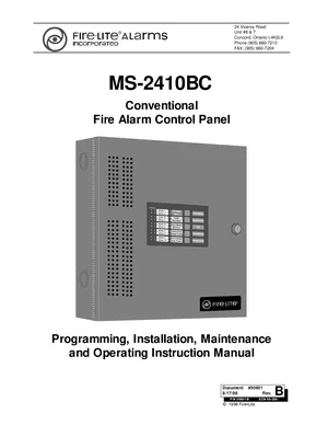 Installation, Operations, and Programming Manual for the Fire-Lite MS-2410BC, published in 1998. Document No: 50801, Rev: B. 22 models including MS-2410BC, DP-2410BC, XRM-24 and 19 additional variants. Hardware installation, alarm/fault management, and advanced system configuration.