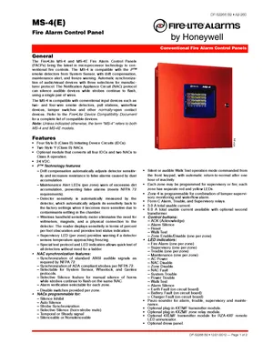 Datasheet for the Fire-Lite MS-4, published in 2012. Document No: DF-52266, Rev: B2. 13 models including MS-4, MS-4E, CAC-4 and 10 additional variants. Product features, environmental operating limits, and compatibility data.