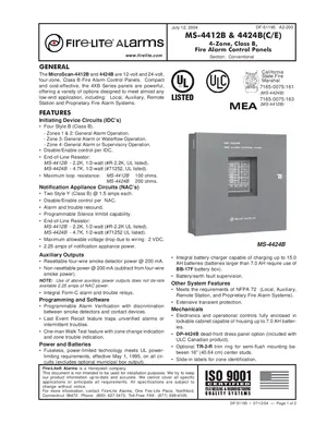 Datasheet for the Fire-Lite MS-4412B and MS-4424B, published in 2004. Document No: DF-51195, Rev: A2-200. 21 models including MS-4412B, MS-4424B, MS-4424BC and 18 additional variants. Product features, environmental operating limits, and compatibility data.