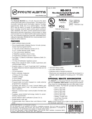 Datasheet for the Fire-Lite MS-5012, published in 2004. Document No: DF-51186, Rev: A3-100. 9 models including MS-5012, RZA-5F, ADM-12 and 6 additional variants. Detailed technical specifications, electrical ratings, and agency listings.