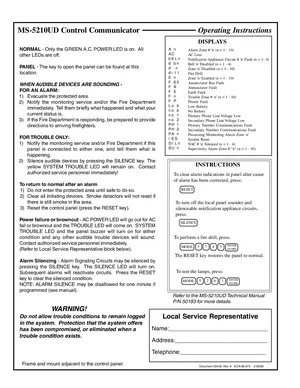 Operating Instructions for the Fire-Lite MS-5210UD, published in 1996. Document No: 50448, Rev: A. Model MS-5210UD. Hardware installation, alarm/fault management, and advanced system configuration.