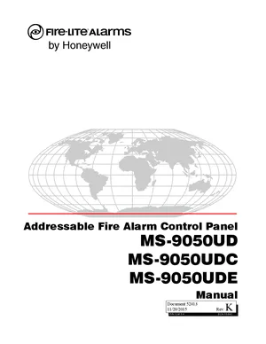 Installation, Operations, and Programming Manual for the Fire-Lite MS-9050UD, published in 2015. Document No: 52413, Rev: K. Models MS-9050UD, MS-9050UDC and MS-9050UDE. Hardware installation, alarm/fault management, and advanced system configuration.