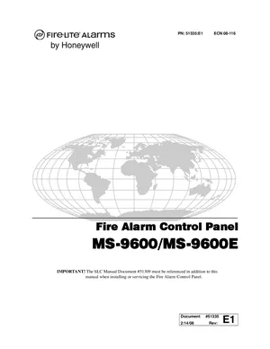 Installation, Operations, and Programming Manual for the Fire-Lite MS-9600 and MS-9600E, published in 2008. Document No: 51335, Rev: E1. 62 models including MS-9600, MS-9600E, CP350 and 59 additional variants. Hardware installation, alarm/fault management, and advanced system configuration.