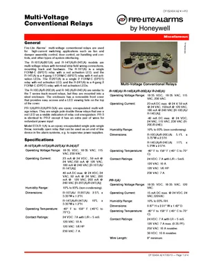 Datasheet for the Fire-Lite Multi-Voltage Conventional Relays, published in 2013. Document No: DF-52404, Rev: A2. 24 models including R-10T, R-10TA, R-14T and 21 additional variants. Product features, environmental operating limits, and compatibility data.
