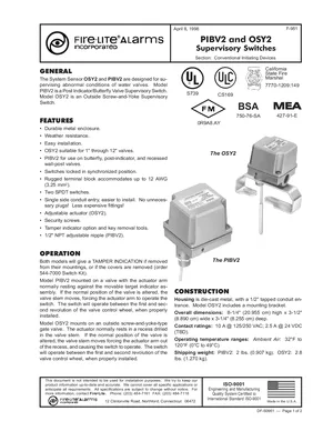 Datasheet for the Fire-Lite PIBV2 and OSY2, published in 1998. Document No: DF-50961. 5 models including PIBV2, OSY2, PIBV2A and 2 additional variants. Engineering specifications, wiring diagrams, and mounting dimensions.