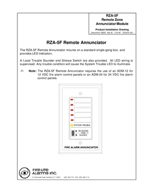 Installation Manual for the Fire-Lite RZA-5F, published in 1997. Document No: 15635, Rev: B. Models RZA-5F, ADM-12 and ADM-24. Hardware installation, terminal connections, and environmental requirements.