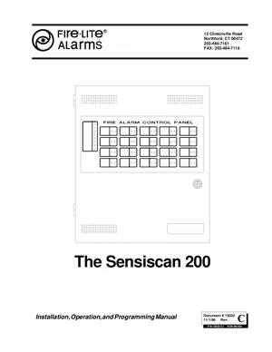 Installation, Operations, and Programming Manual for the Fire-Lite Sensiscan 200, published in 1996. Document No: 15032, Rev: C1. 25 models including Sensiscan 200, CPU-2000, BE-200 and 22 additional variants. Hardware installation, alarm/fault management, and advanced system configuration.