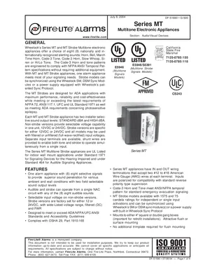 Datasheet for the Fire-Lite MT Series Multitone Appliances, published in 2004. Document No: DF-51690, Rev: G-500. 6 models including MT-12/24-R, MT-241575W-FR, MT-2475W-FR and 3 additional variants. Detailed technical specifications, electrical ratings, and agency listings.