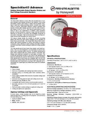 Datasheet for the Fire-Lite SpectrAlert Advance Outdoor Speakers, published in 2011. Document No: DF-60326, Rev: c1. 14 models including SPWK, SPWK-A, SPRK and 11 additional variants. Detailed technical specifications, electrical ratings, and agency listings.