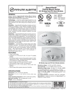 Datasheet for the Fire-Lite SpectrAlert Ceiling Mount Series, published in 2004. Document No: DF-52086, Rev: G-450. 28 models including SC2415, SC2415W, SC241575 and 25 additional variants. Engineering specifications, wiring diagrams, and mounting dimensions.
