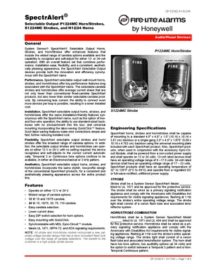 Datasheet for the Fire-Lite SpectrAlert Selectable Output, published in 2006. Document No: DF-52392, Rev: A. Models P1224MC, S1224MC and H12/24. Product features, environmental operating limits, and compatibility data.