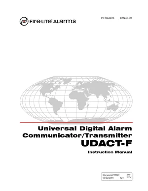 Installation, Operations, and Programming Manual for the Fire-Lite UDACT-F, published in 2001. Document No: 50049, Rev: E. 21 models including UDACT-F, UDACT-D, MS-9200 and 18 additional variants. Complete system installation, daily operation procedures, and detailed programming configurations.
