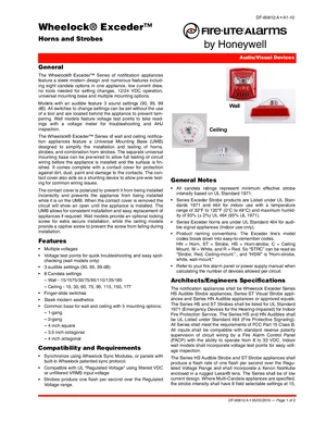 Datasheet for the Fire-Lite Wheelock Exceder Horns and Strobes, published in 2010. Document No: DF-60612, Rev: A. 12 models including HSR, HSW, HSRC and 9 additional variants. Product features, environmental operating limits, and compatibility data.