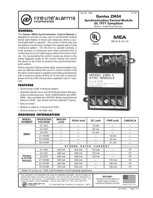 Datasheet for the Fire-Lite ZMS4 Sync Module, published in 1998. Document No: DF-51942. 10 models including ZMS4, GXS, GX90 and 7 additional variants. Engineering specifications, wiring diagrams, and mounting dimensions.