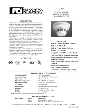 Datasheet for the Gamewell FCI 2400, published in 2003. Document No: 9020-0587, Rev: 1.0. Models 2400 and 2400T. Engineering specifications, wiring diagrams, and mounting dimensions.
