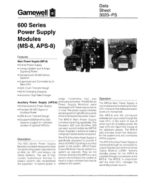 Datasheet for the Gamewell FCI 600 Series Power Supply Modules (MS-8, APS-8), published in 1999. Document No: 3020-PS. 7 models including MS-8, APS-8, MP-8 and 4 additional variants. Engineering specifications, wiring diagrams, and mounting dimensions.
