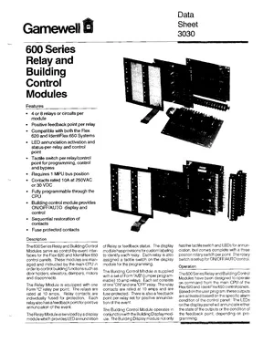 Datasheet for the Gamewell FCI 600 Series Relay and Building Control Modules, published in 1992. Document No: 3030, Rev: 3/92. 4 models including RM-4, RM-8, BC-4 and 1 additional variants. Product features, environmental operating limits, and compatibility data.